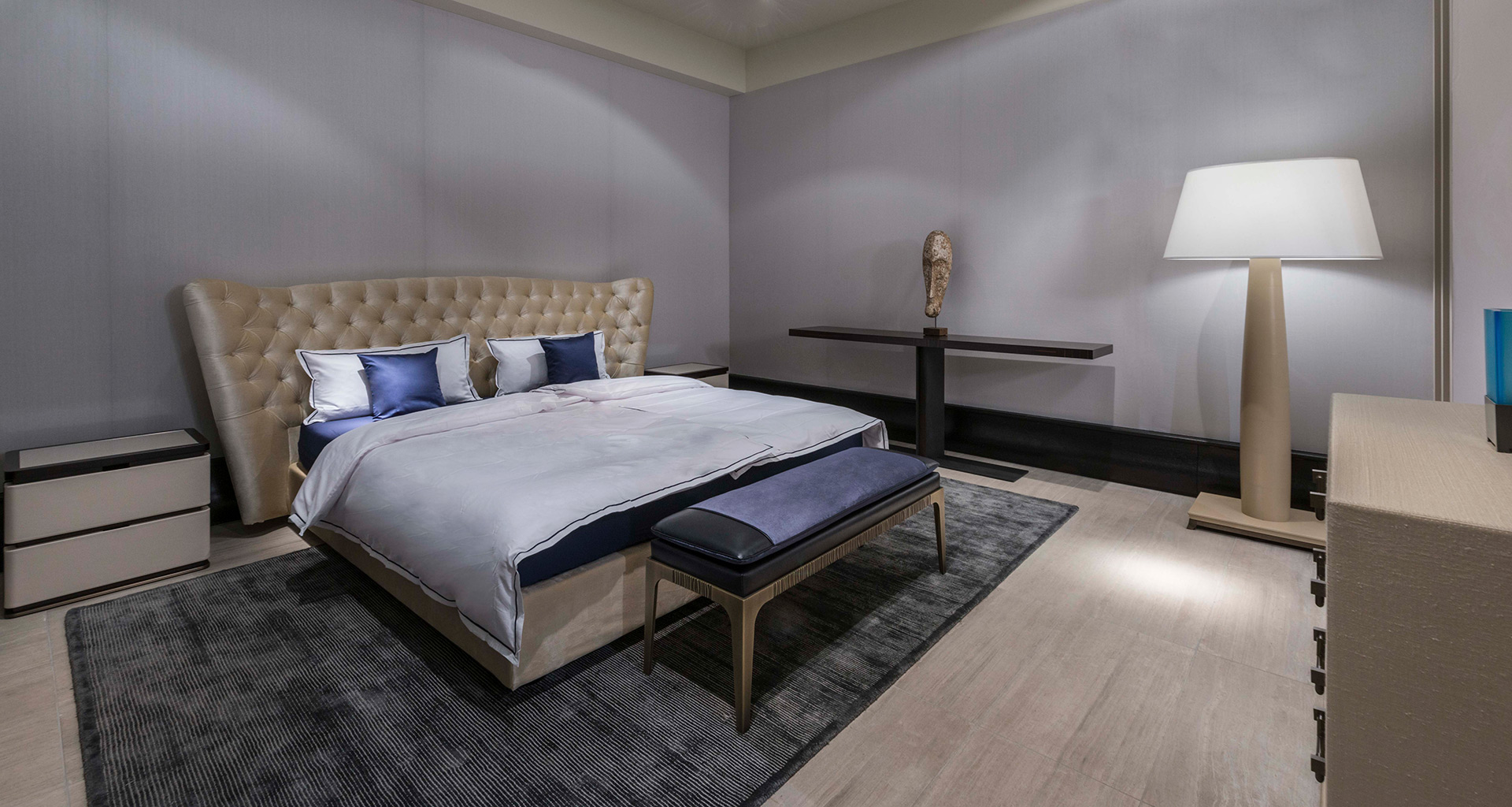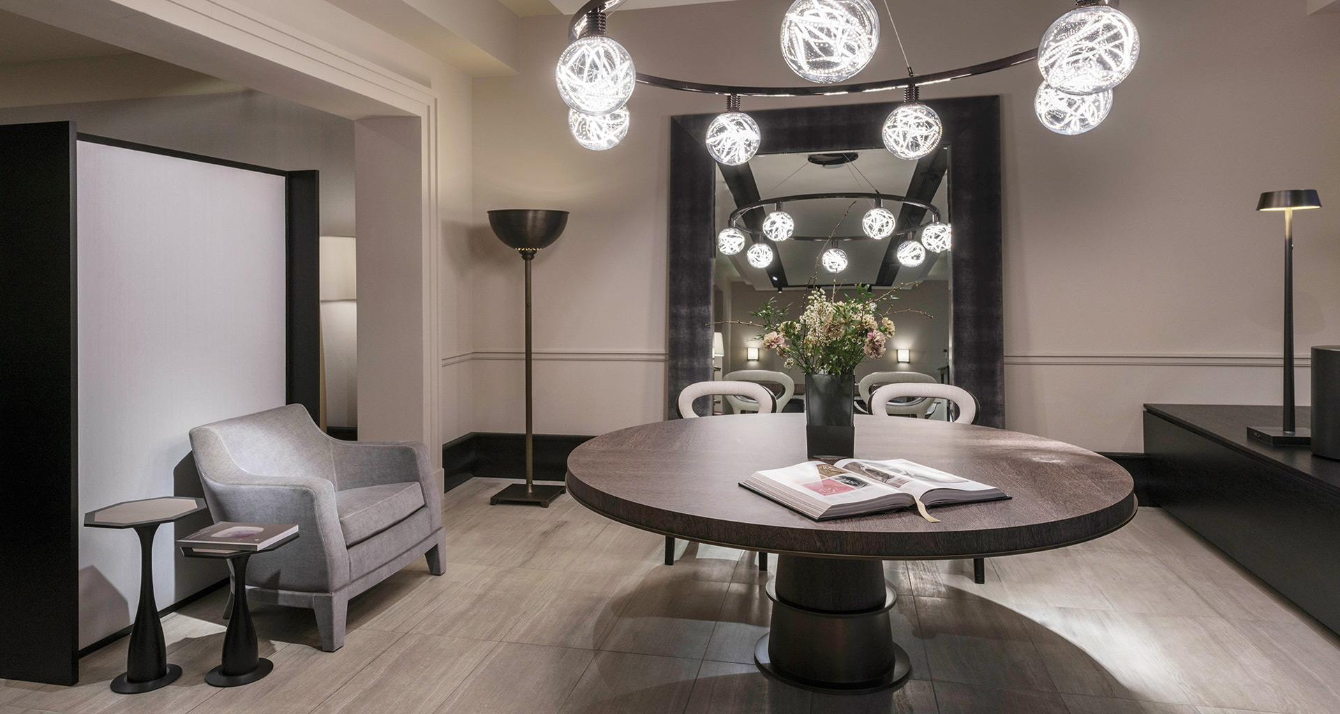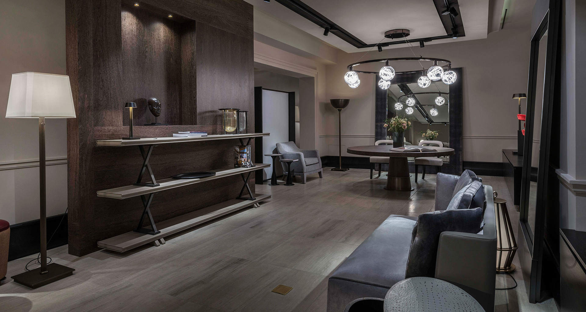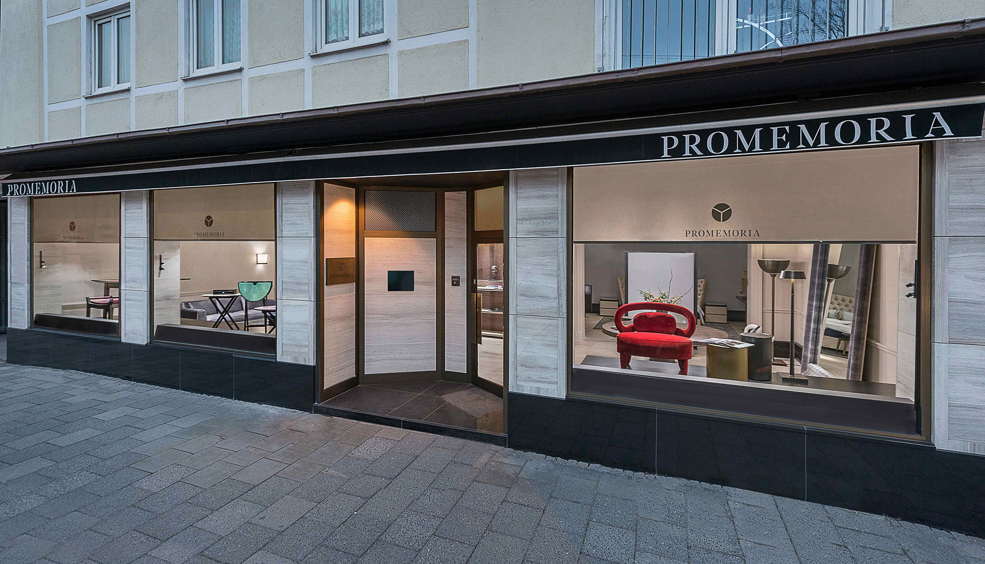 • Der Promemoria Ausstellungsraum München befindet sich im künstlerischen Zentrum der Stadt nahe der Pinakothek der Moderne. Die drei großen Fenster an der Fassade bieten Ein- und Ausblick auf einen Raum mit einer Fläche von 130 Quadratmetermetern, der in den weichen Farben der aktuellen Promemoria Kollektionen gehalten ist.