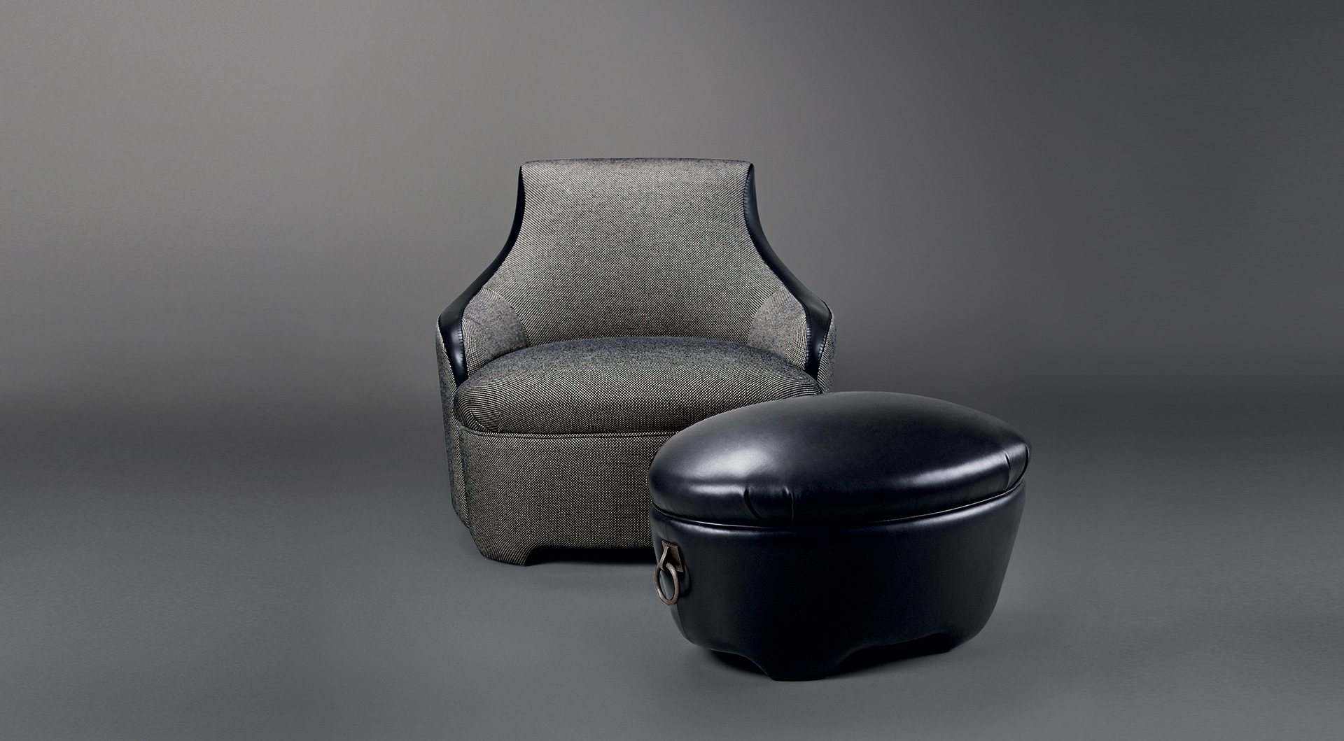 Gioconda is a pouf completely covered in non-removable fabric or leather. The comfortable design is completed by bronze side handles.
