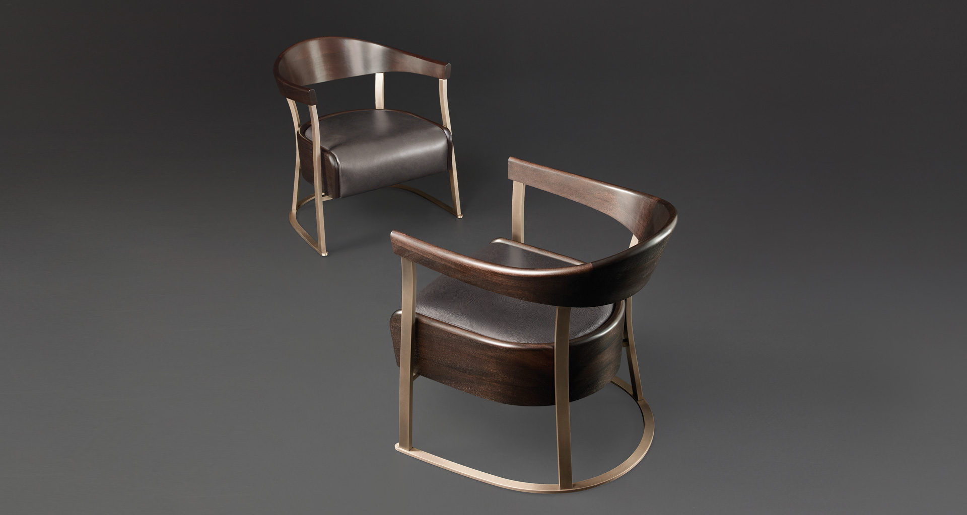Rachele comes in two variants: seat and backrest in leather; backrest and profile of the seat in brown mahogany and seat in leather.