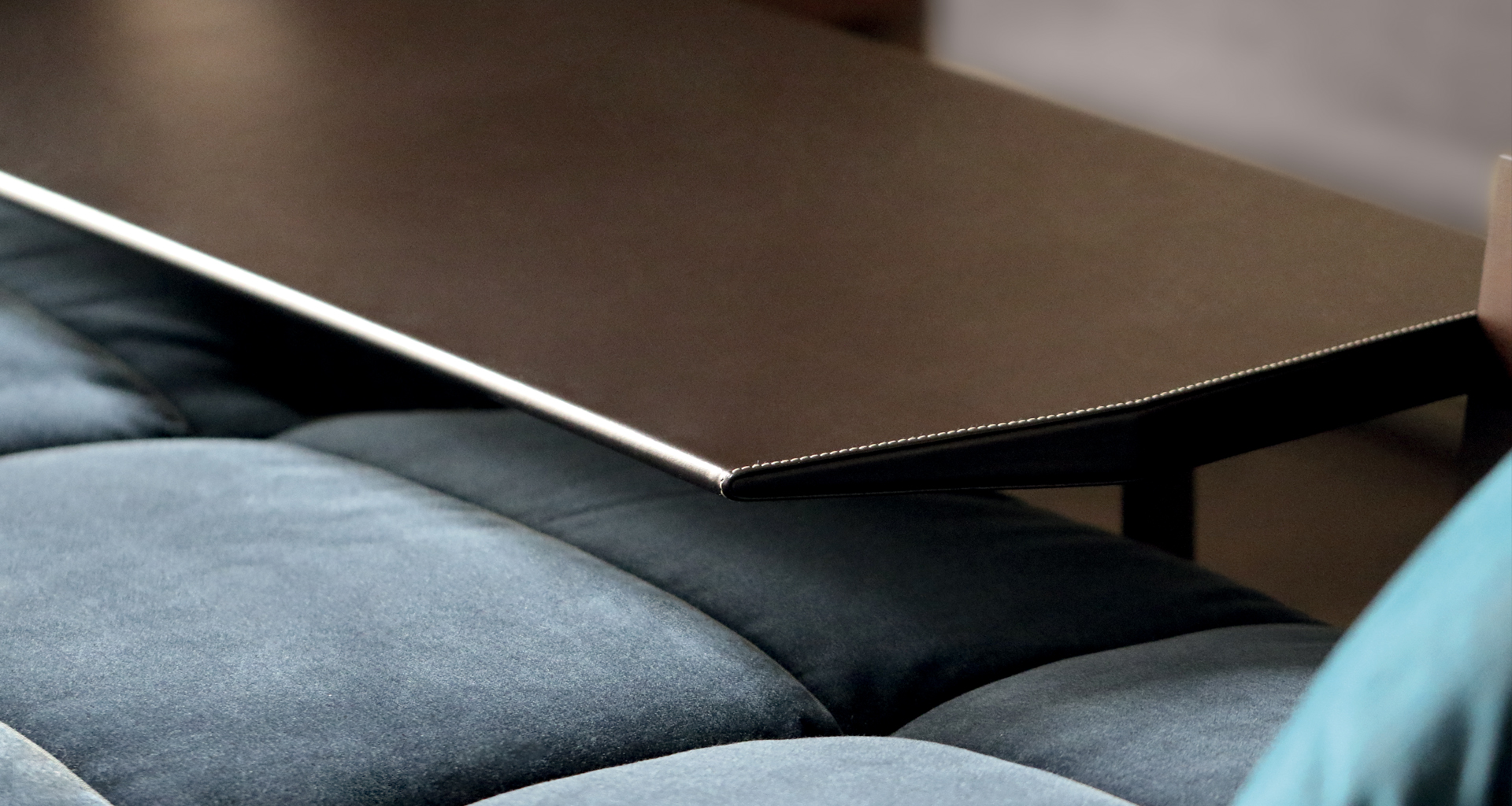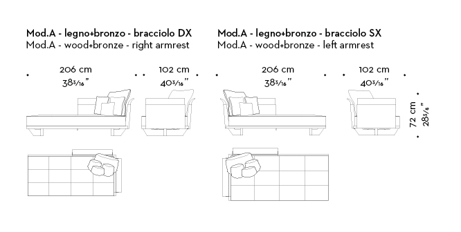 Il divano è disponibile a due e a tre posti, con struttura in rovere naturale, antracite, antico, e dettagli in bronzo, oppure completamente rivestita in pelle o tessuto. Il cuscino di seduta, non sfoderabile, ha trapuntature rettangolari rifinite da una passamaneria sartoriale abbinata al tessuto scelto per il rivestimento. Il divano a tre posti con due schienali può essere accessoriato da un tavolino in pelle e bronzo.
