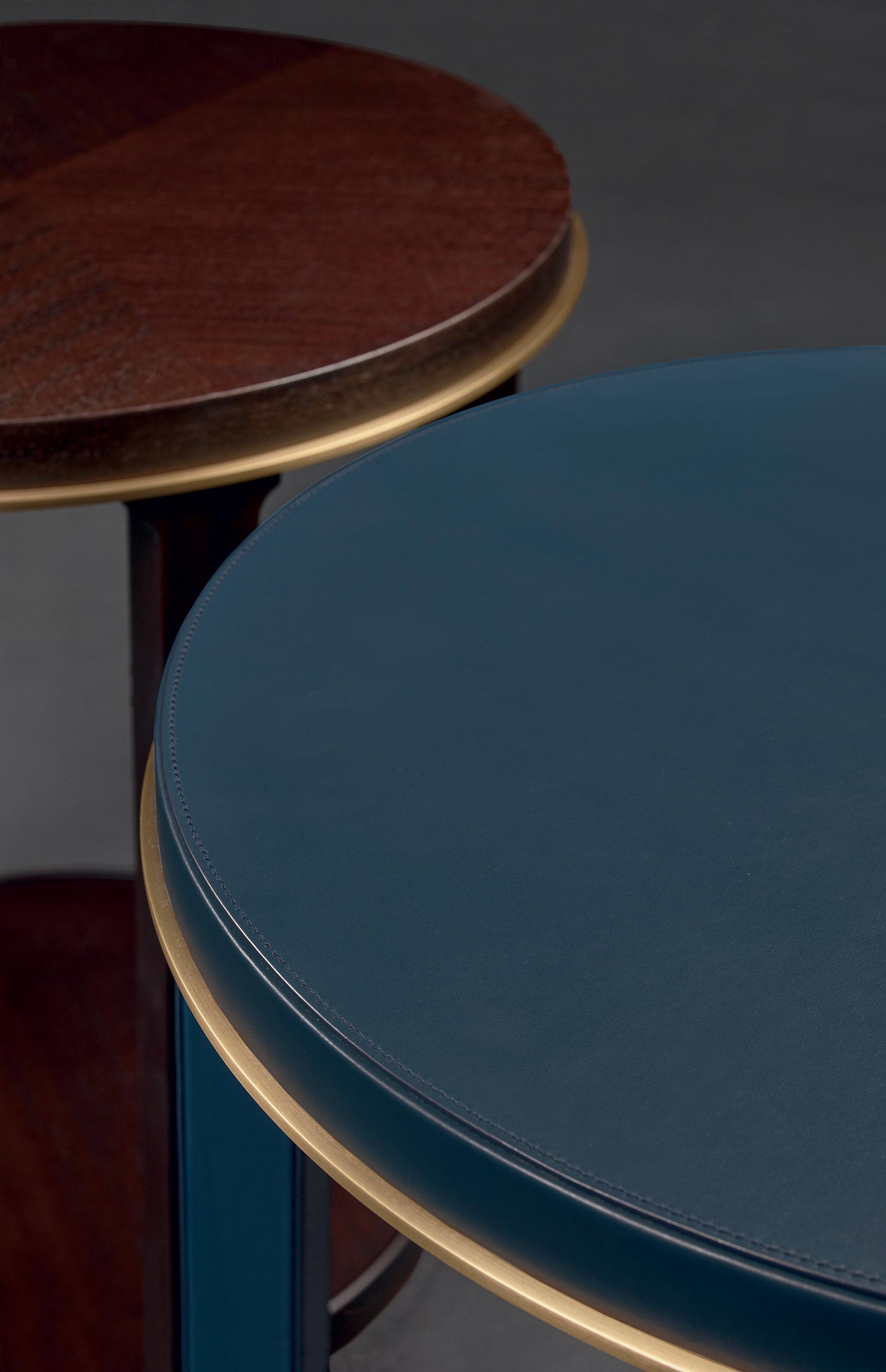 Tavolino e gueridon, la sua struttura è in mogano bruno o rivestita in pelle, con base e profilo del top in bronzo medio liscio.