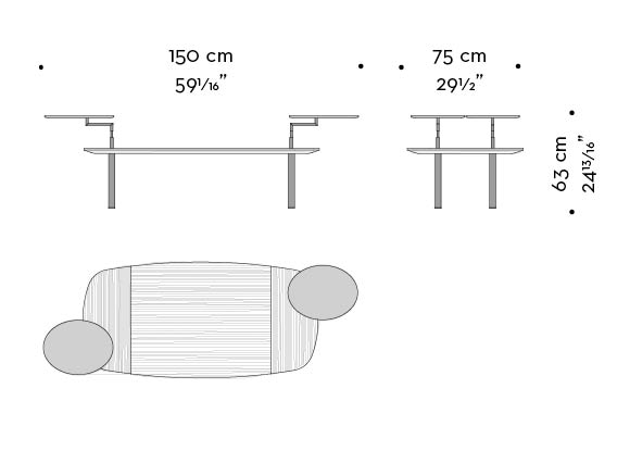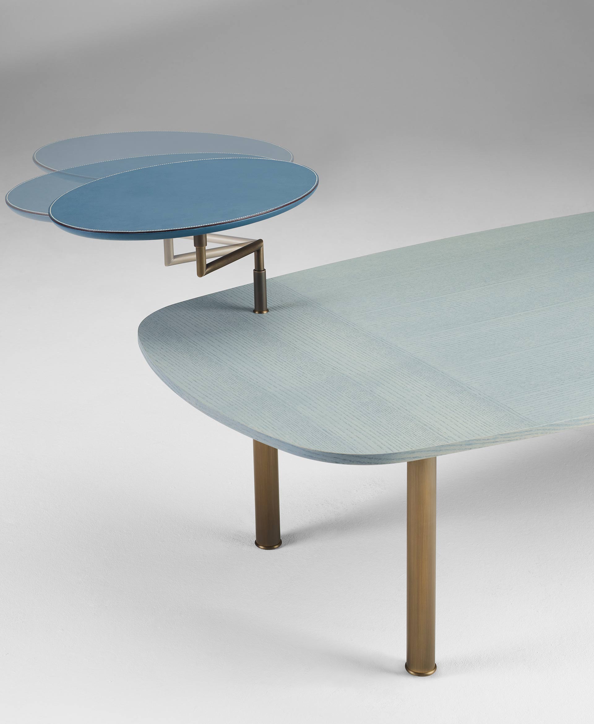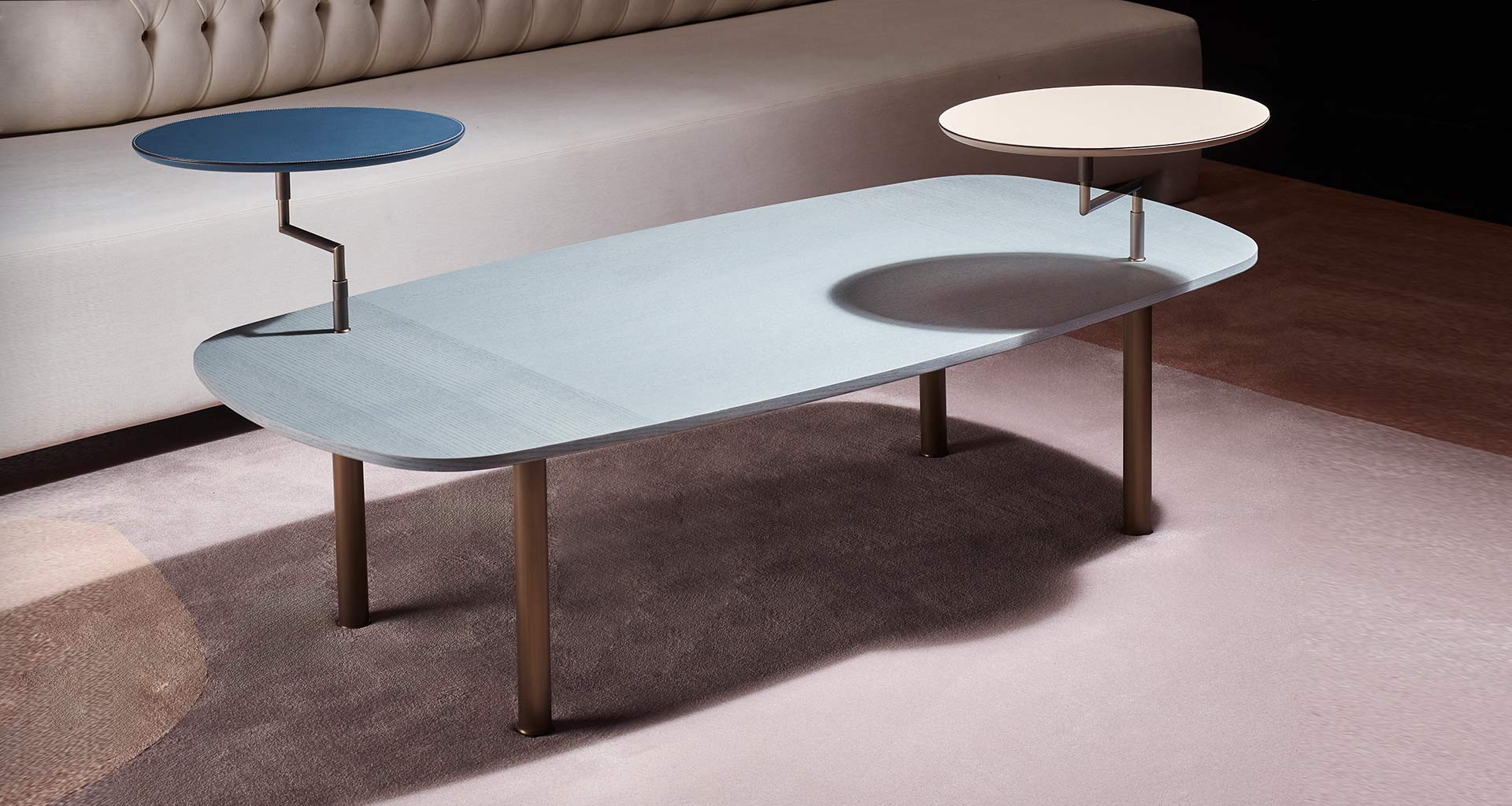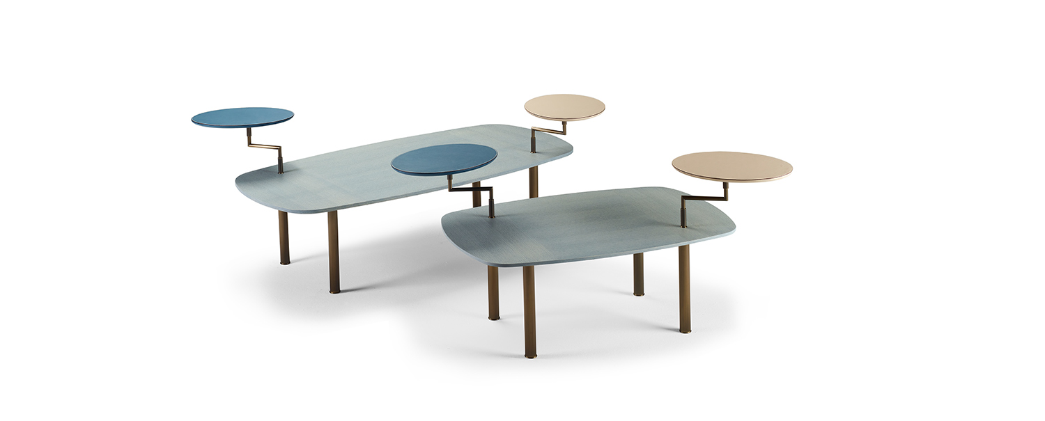Ogni tavolino è dotato di vassoi rotanti fissati al piano, che da semplice supporto lo trasformano in un oggetto interattivo e versatile. La possibilità di combinare, spostare o ruotare i vassoi rende ogni tavolino dinamico, capace di adattarsi alle esigenze del momento: un caffè tra amici, un aperitivo, oppure la disposizione dei propri oggetti più preziosi.